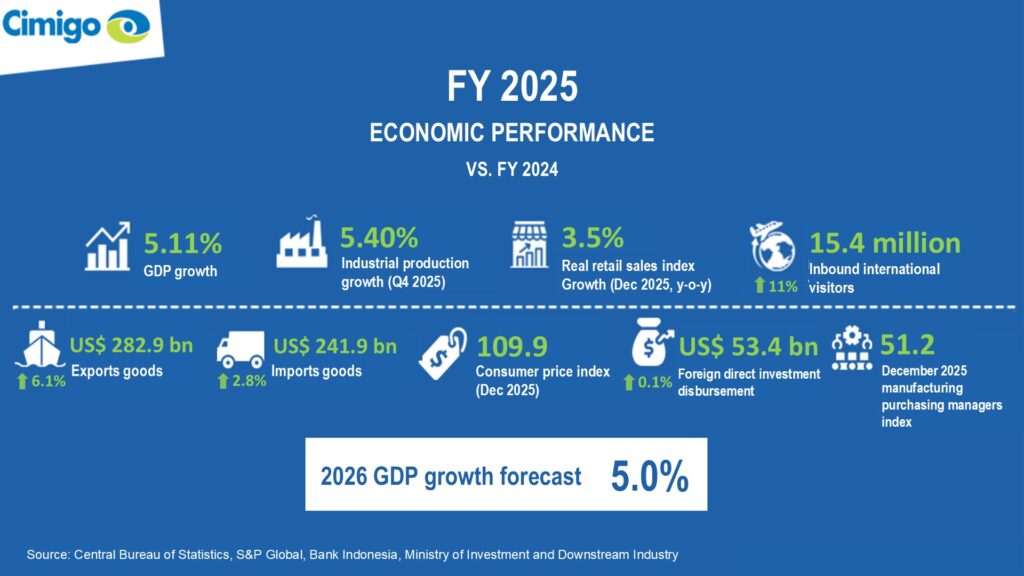 Indonesia concluded 2025 with steady economic growth and resilient underlying fundamentals, although signs of moderation are becoming increasingly apparent across sectors. While headline indicators remain positive, rising inflation and ongoing labour market challenges suggest a more uneven economic environment as the country moves into 2026.