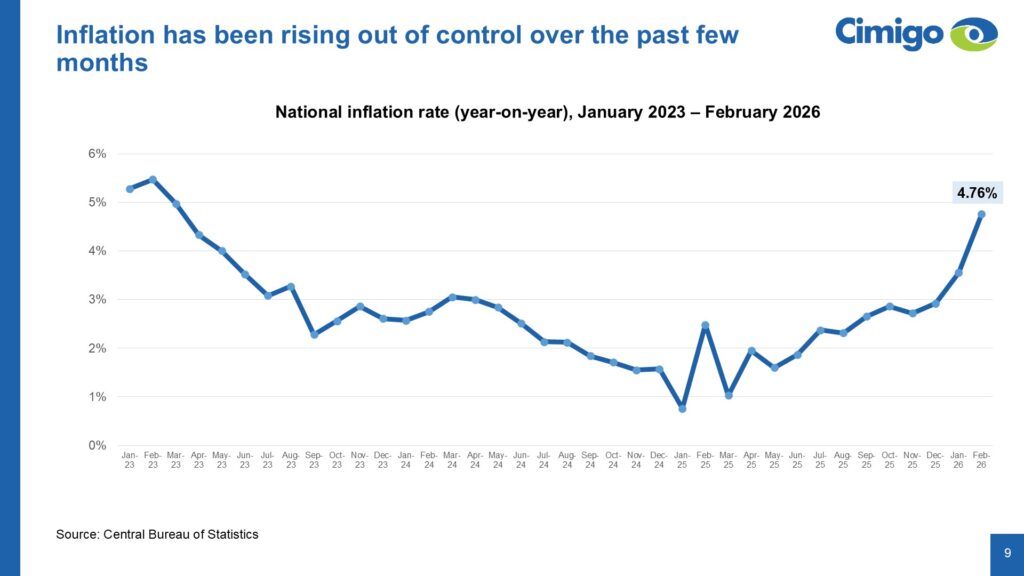 One of the most significant developments towards the end of 2025 has been the acceleration of inflation, reaching approximately 4.76% year-on-year in early 2026. Rising prices have begun to place pressure on household purchasing power as well as business operating costs.