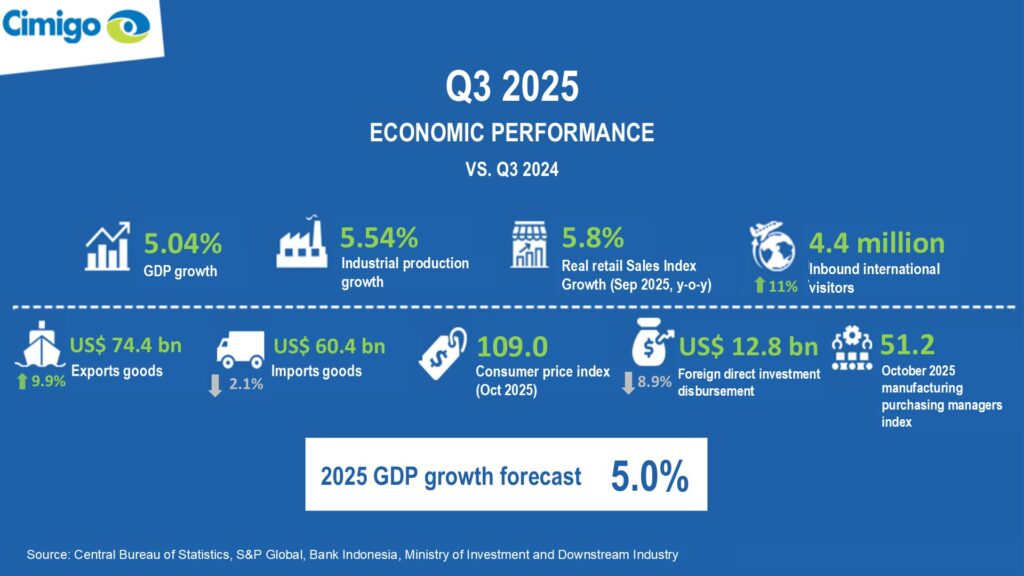 Indonesia’s economy continues on a cautious upward path. The third quarter of 2025 reveals both new opportunities and persistent challenges for decision-makers seeking clarity in a shifting environment. This article examines the country’s economic environment from Cimigo‘s perspective – Indonesia’s economic outlook.