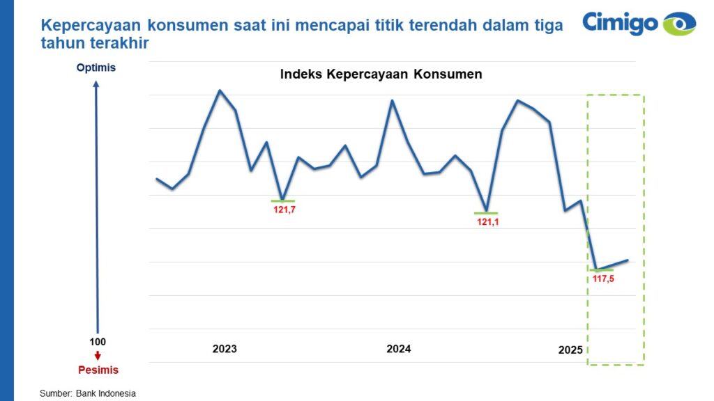 Sebaliknya, kepercayaan konsumen menunjukkan kekhawatiran yang semakin besar. Indeks Kepercayaan Konsumen turun ke titik terendah dalam tiga tahun terakhir, mencerminkan penurunan sentimen yang signifikan. Kondisi ini berdampak pada perilaku belanja, di mana rumah tangga semakin berhati-hati menghadapi ketidakpastian ekonomi.