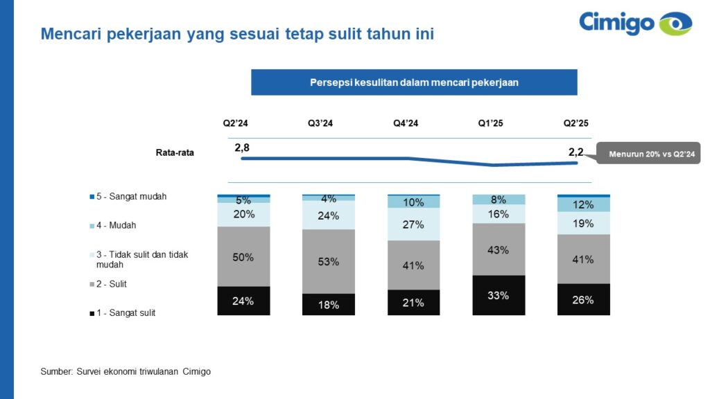 Data kinerja ritel dari awal tahun hingga saat ini menunjukkan pertumbuhan sebesar 1,9% pada penjualan ritel riil. Pertumbuhan ini terutama ditopang oleh sektor kebutuhan pokok seperti makanan, minuman, dan tembakau. Pergeseran ini menunjukkan bahwa rumah tangga lebih mengutamakan konsumsi esensial sebagai respons terhadap tekanan ekonomi. Secara keseluruhan, sektor ritel berada dalam tantangan, terutama terkait persepsi konsumen. Survei terbaru Cimigo pada Q2 menunjukkan bahwa mendapatkan pekerjaan yang sesuai semakin sulit, dengan tingkat kesulitan yang jauh lebih tinggi dibandingkan tahun lalu. Ketidakpastian ini kemungkinan besar turut mendorong sikap lebih hati-hati dalam pengeluaran rumah tangga.